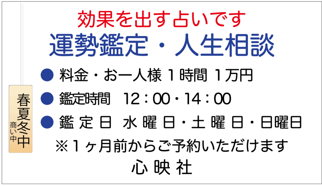 鑑定日時 水曜日・土曜日・日曜日 12時・14時(各曜日2枠)