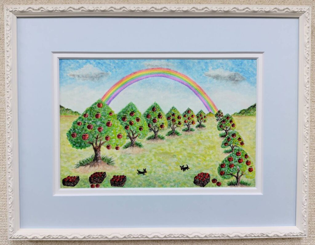 丸い赤いりんごの木から溢れだす幸福感を表現しました。